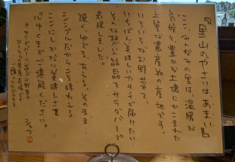 どの野菜も素材の味を生かしてそのままで、もしくは非常にシンプルな味付けになっています。シェフ、ほんとうに里山のやさいはあまかったです。