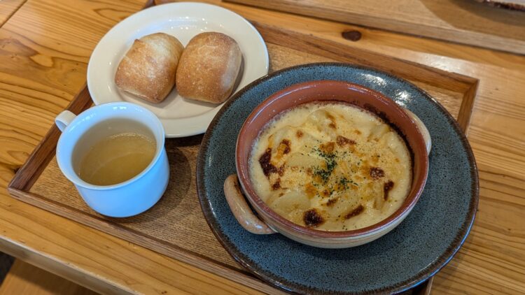 グラタンはじゃがいもがホクホクでチーズもたっぷり! パンは外カリッ・中モチッでおいしかったです。幼児食を食べている子なら食べられるくらいのかたさでした。